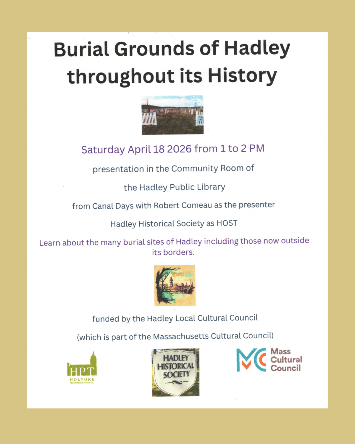 The Hadley Historical Society presents The Burial Grounds of Hadley Throughout Its History, with presenter Robert Comeau.